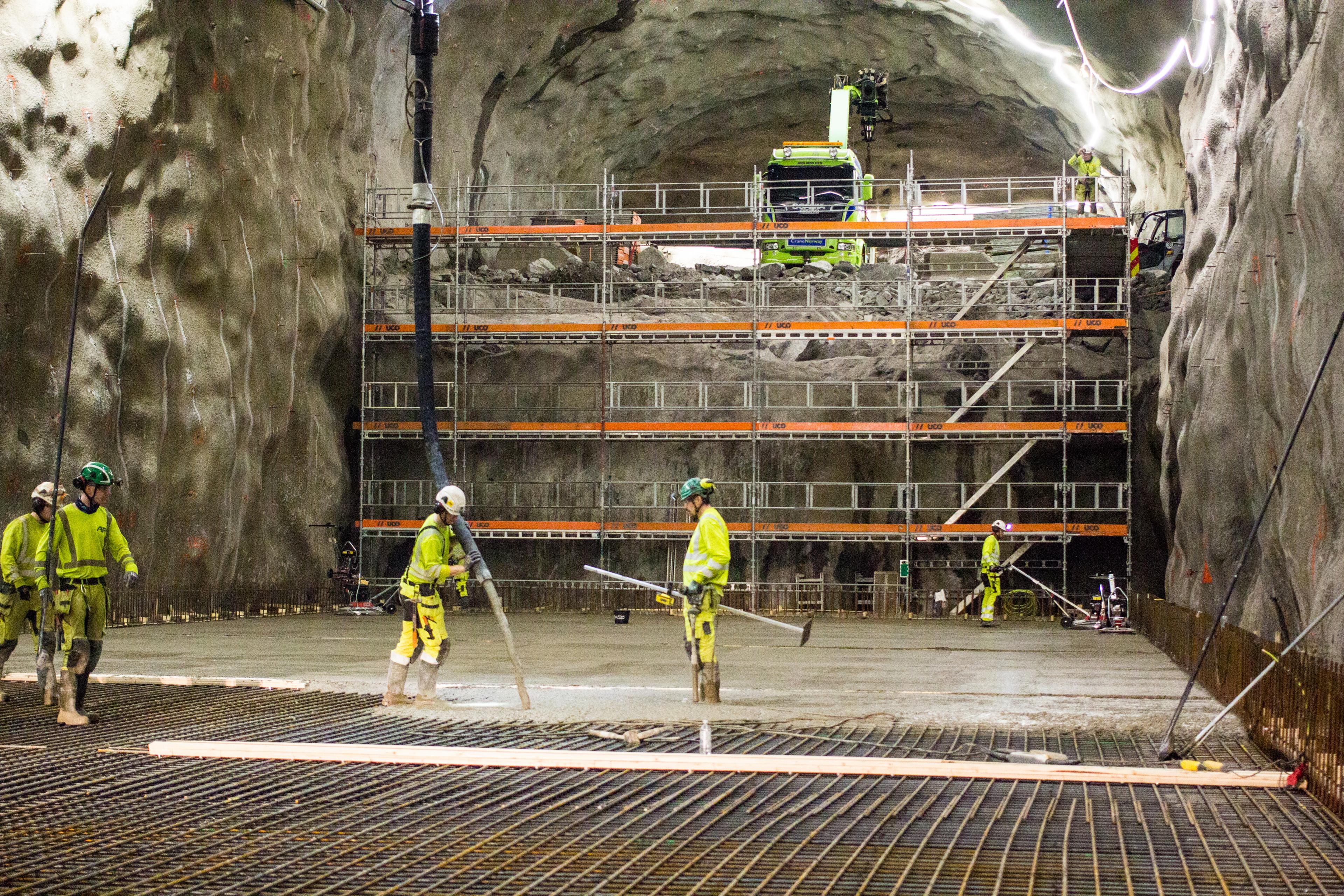 Godt samarbeid i fjellhallen mens betongen legges. Bunnplatene er fundamentet som hele det nye anlegget skal hvile på.