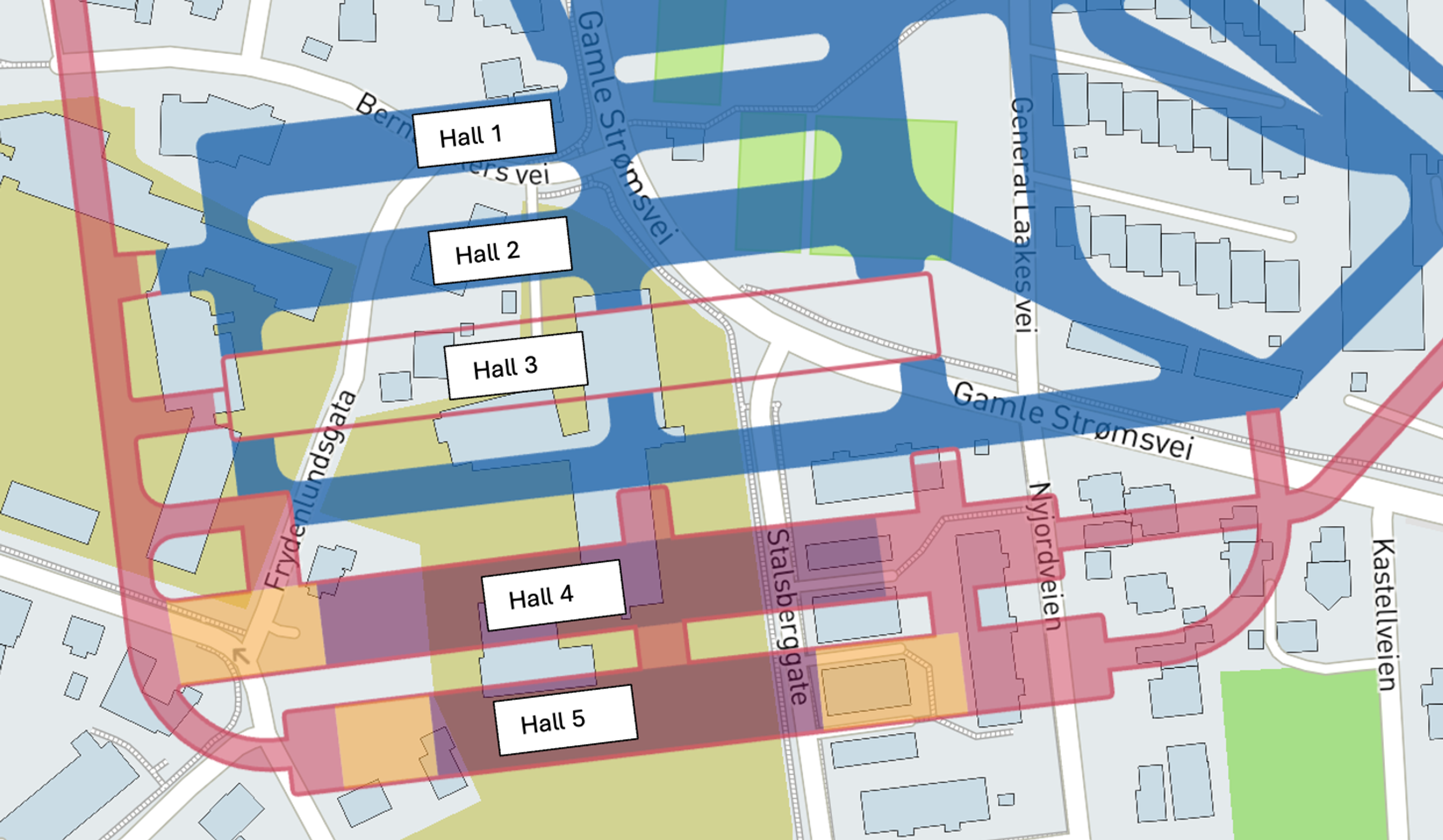 I sør arbeides det nå med hall 4 og 5 (se kart).